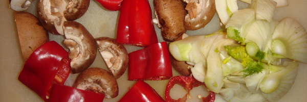 Adding colour and crunch: red peppers, chunky mushrooms and fennel.