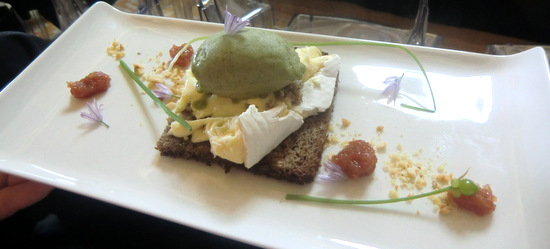 Wild garlic sorbet with clare brie cheese on rye bread with hazelnuts
