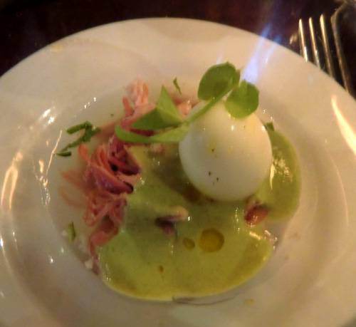 Soft boiled quail’s egg, ham hock jelly, mint