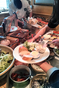 Action shot from the French Market buffet: oysters are being chucked in the background.