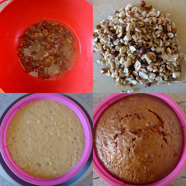 Soaking dates, chopping nuts, batter, and finally, the cake.