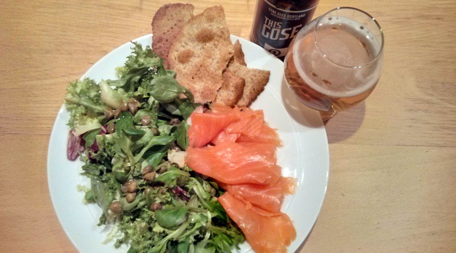 And today, dinner is: Loch Fyne Oysters’ smoked salmon, salad with capers, home-made crisp bread and This Gose.