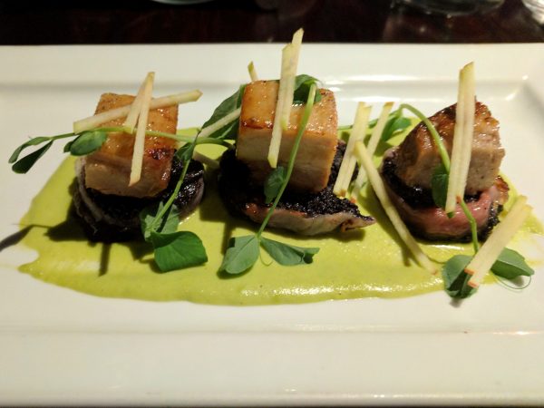 The matchisticks of apples on top of the pork belly are fresh and crunchy: the black pudding below is rich and soft.
