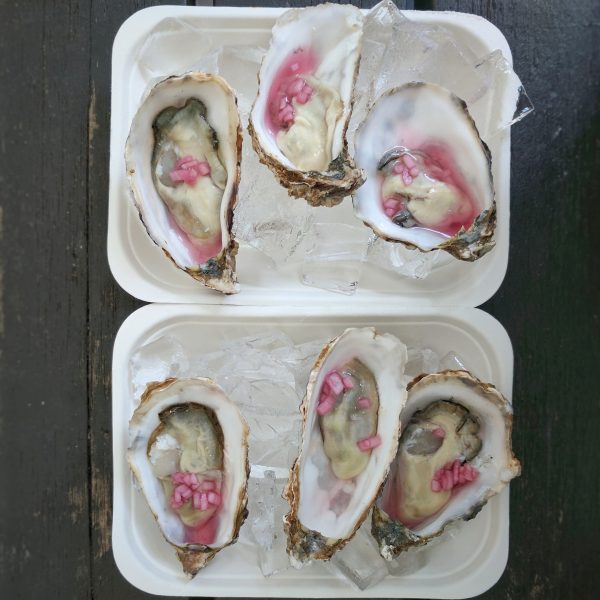 Half a dozen oysters, shucked and ready to eat, on ice.
