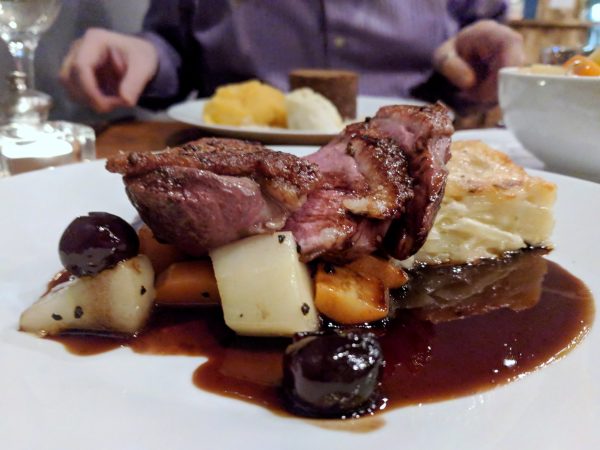 Duck with port and cherry sauce and dauphinoise potatoes.