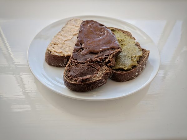 Rye toast with cashewnut butter, home-made and bought chocolate spread and pistachio nut butter.