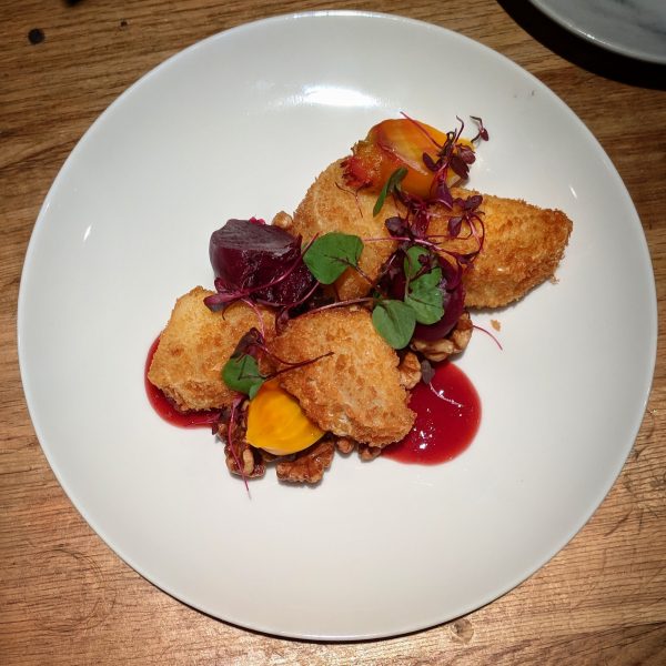 Crispy-fried goats cheese served with pickled beetroot (yum!) and cumberland sauce. Sweet and savoury all together.