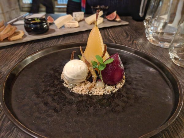 Pears poached in wine and port, with a lovely crumb and cool ice cream.